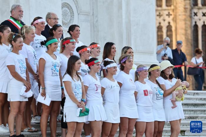 9月4日,在意大利威尼斯,参加传统赛船节成年女子组的选手合影留念。