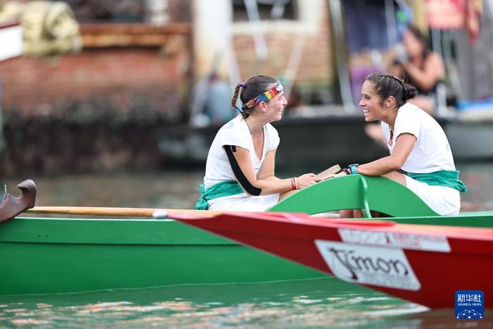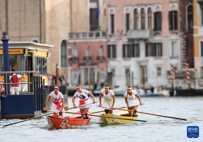 9月7日,在意大利威尼斯, “划行威尼斯”成员朱莉娅·塔利亚彼得拉(右二)与队友拉凯莱·奥代萨(右一)参加传统赛船节比赛。