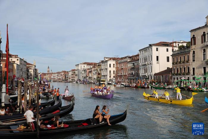 9月7日,在意大利威尼斯, 人们观看传统赛船节比赛。