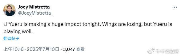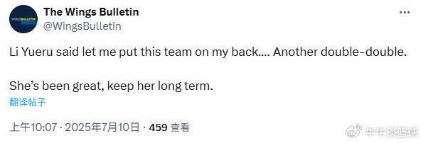 当地媒体The Wings Bulletin:李月汝说让我把这支球队扛在肩上吧……又一个两双!她的表现很棒,让她长期留在飞翼吧。