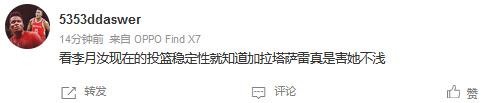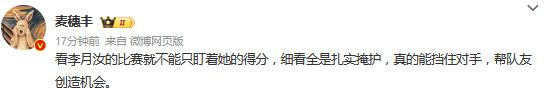 媒体人麦穗丰发文点评:“看李月汝的比赛就不能只盯着她的得分,细看全是扎实掩护,真的能挡住对手,帮队友创造机会。”