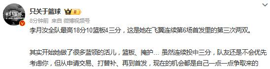 博主只关于篮球发文点评说道李月汝全队最高18分10篮板4三分,这是她在飞翼连续第6场首发里的第三次两双。